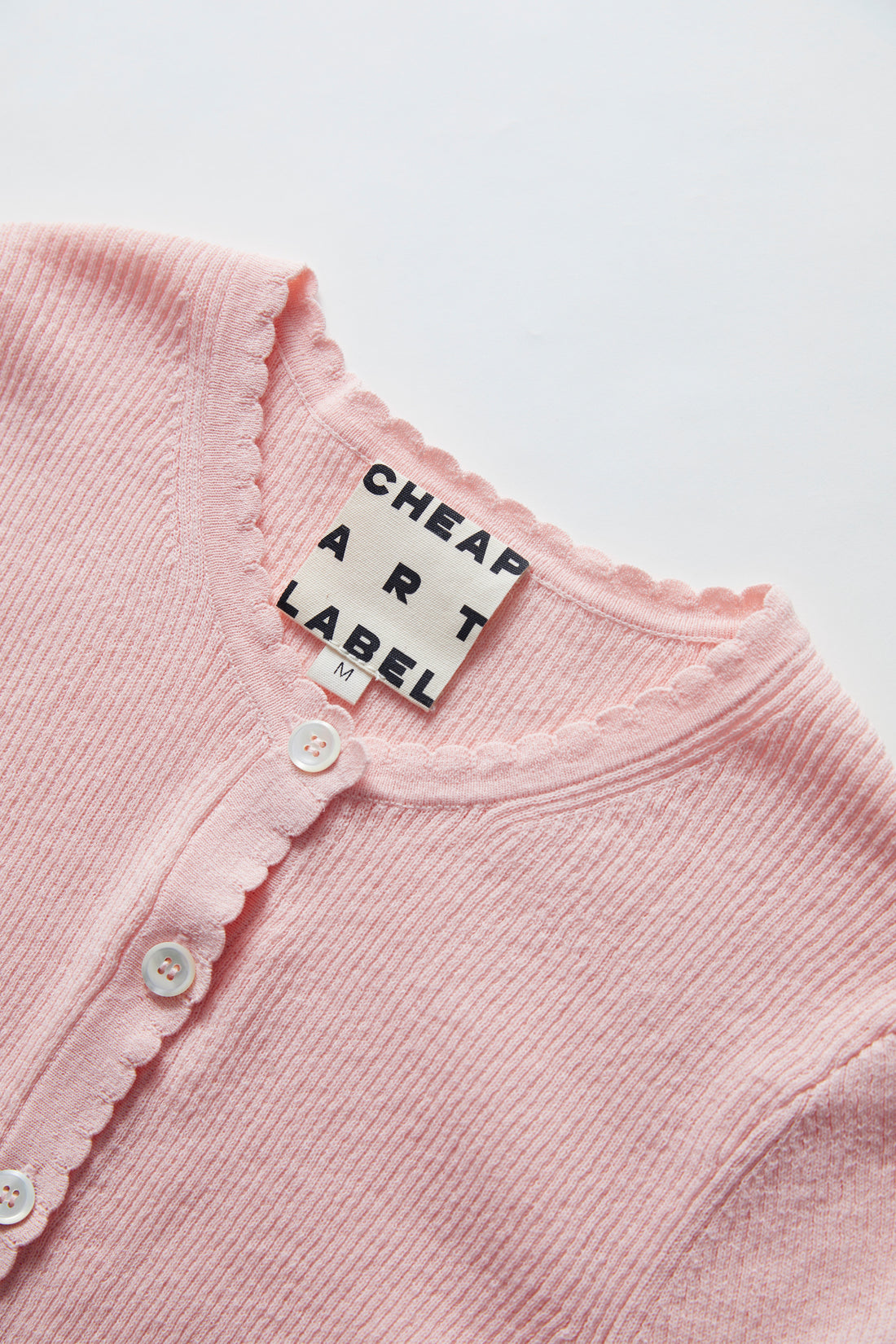 A slim-fit, candy-pink knit cardigan with a soft rib texture and mini scallop edges along...