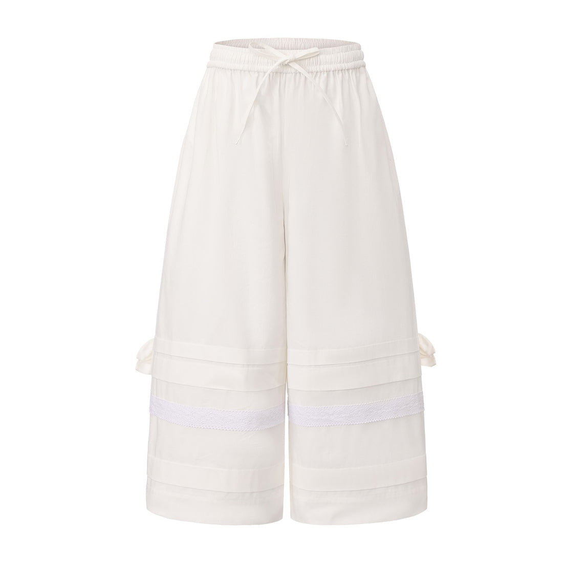 Tucked Elastic Lace-Trim Pants-White