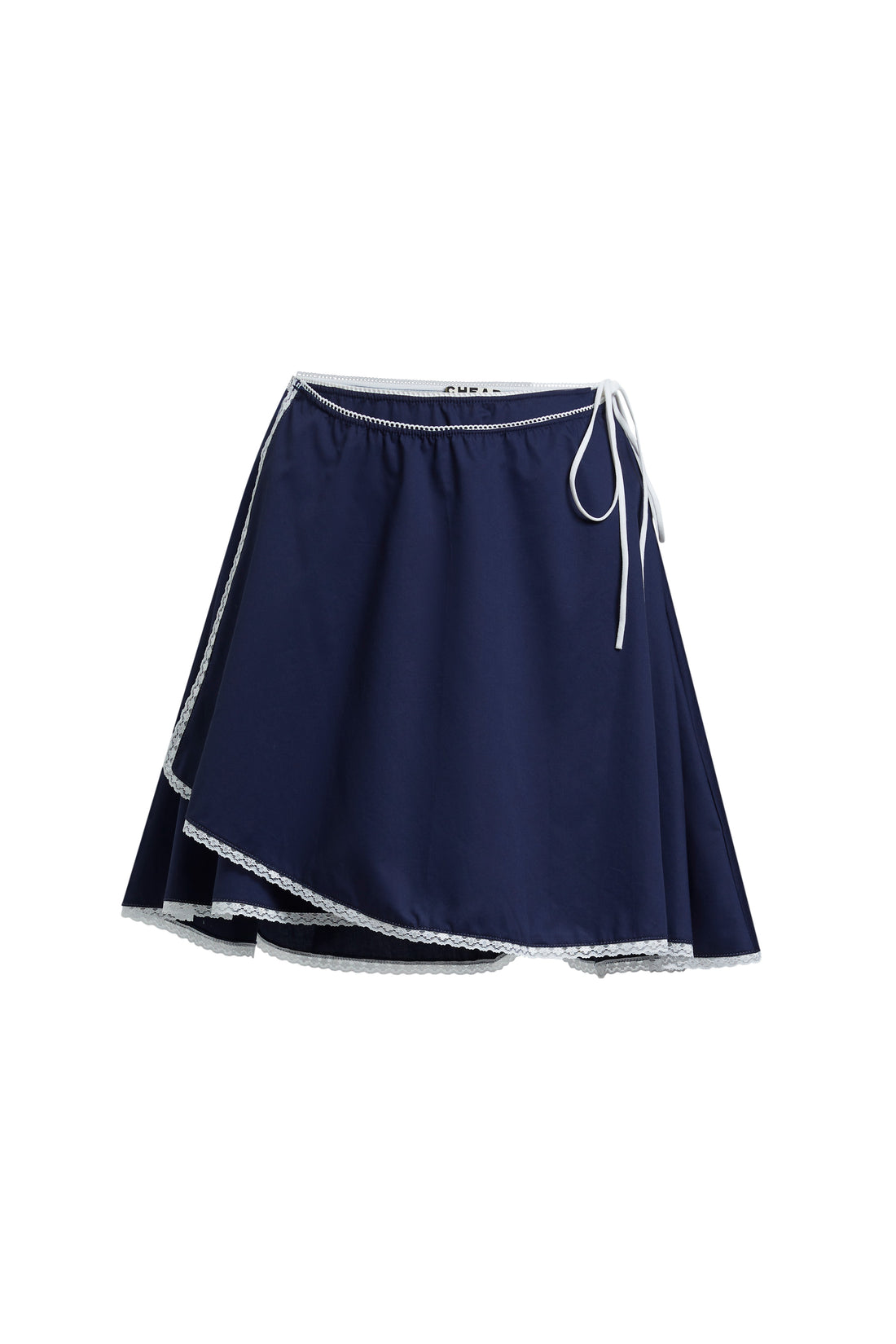 Double-layer asymmetric wrap design with slim tie closure at side waist.Edged with delicate white lace...