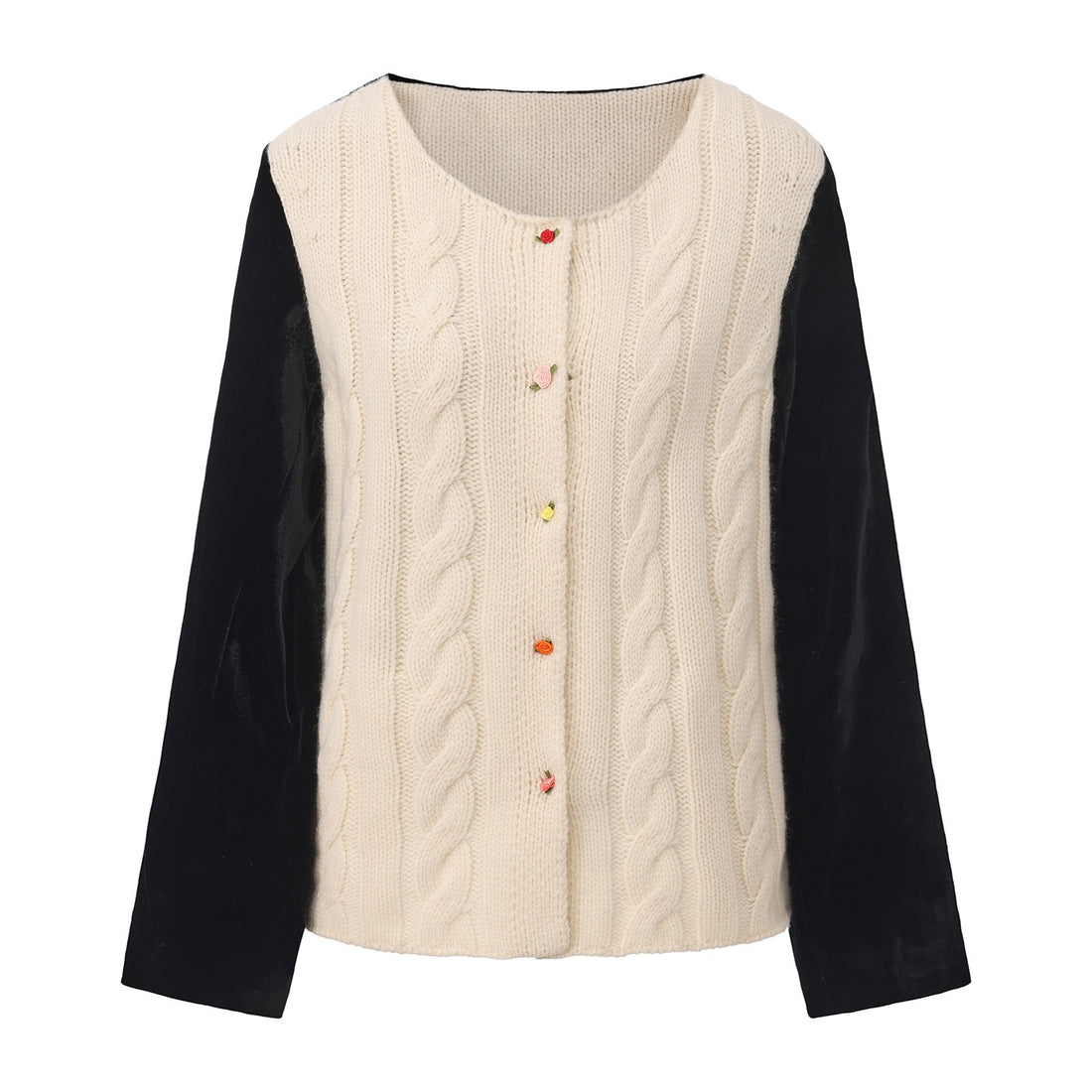 Cream cable-knit body paired with velvet sleeves for a soft winter contrast.3D knit texture adds...
