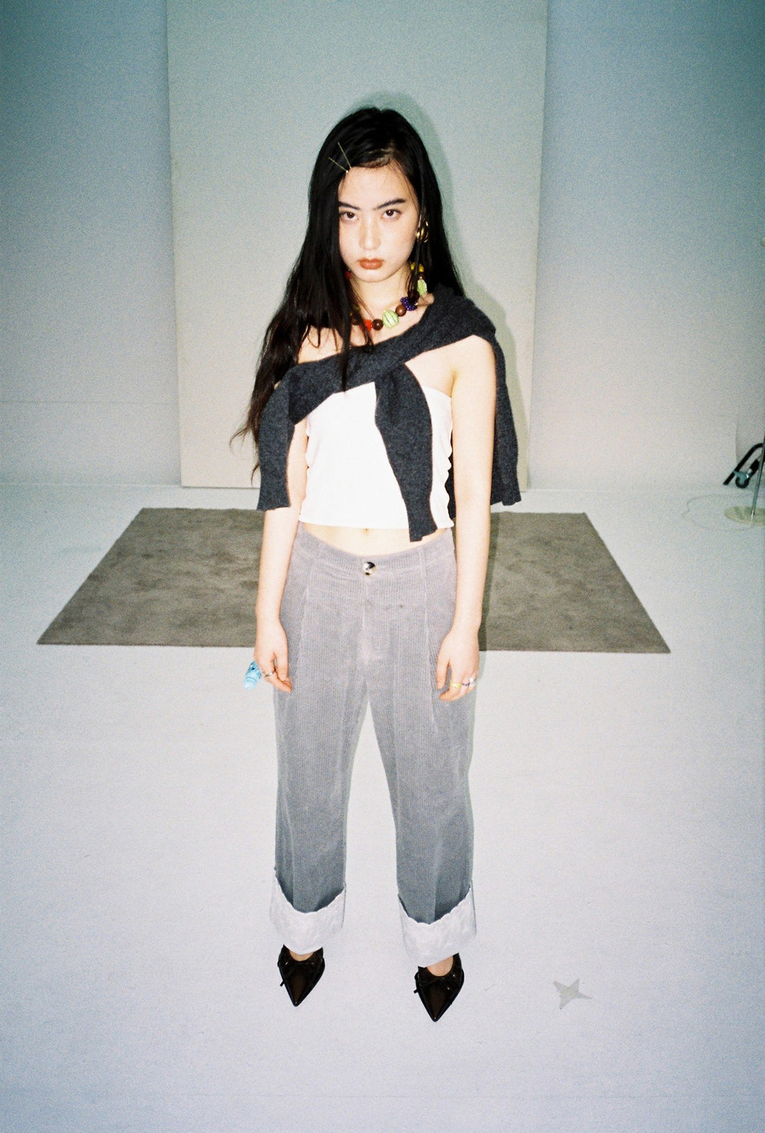 Teal thick-wale corduroy.Front center pleats; straight loose fit.Fixed folded hem with custom cotton lace.Single tortoiseshell...