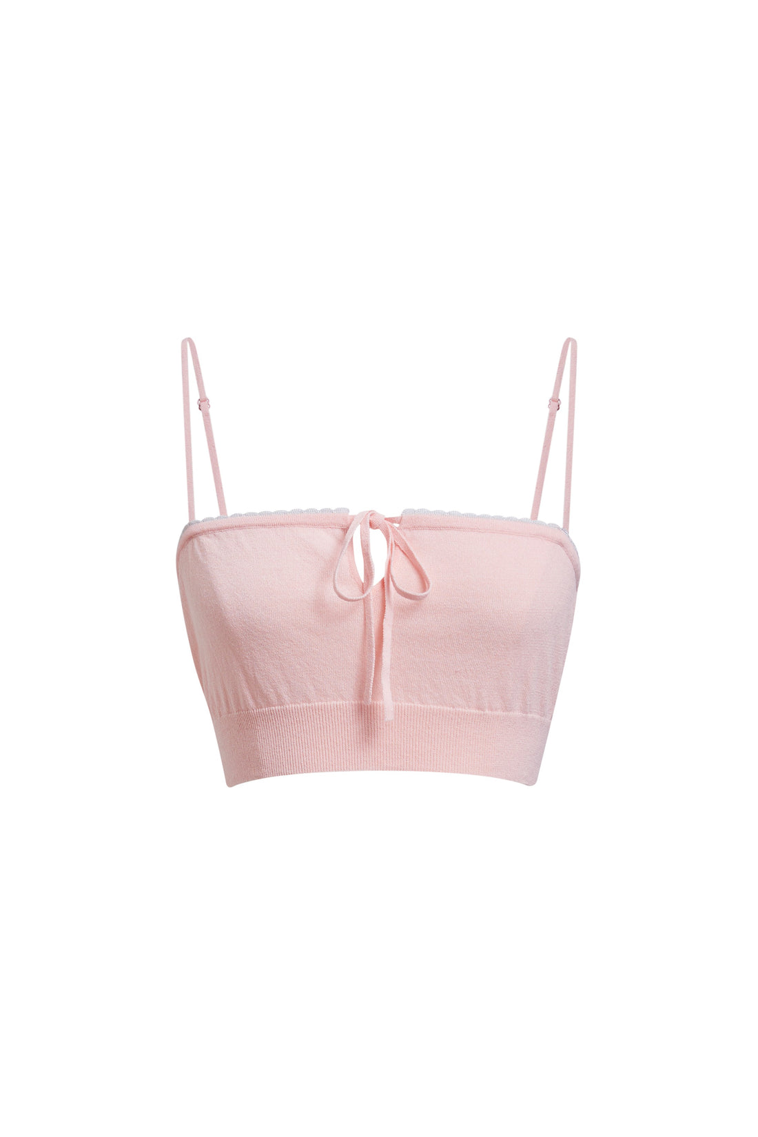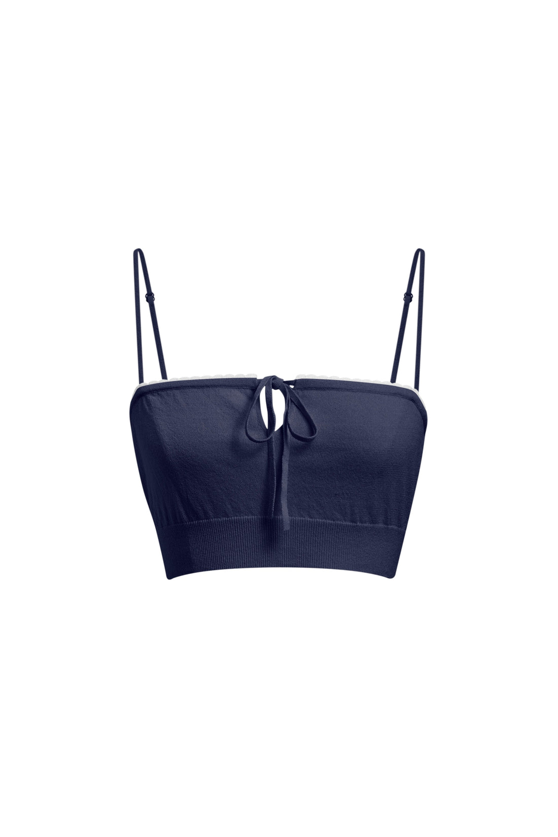 A soft, double-knit camisole in powder pink and navy blue, trimmed with delicate lace-edge piping.Features...