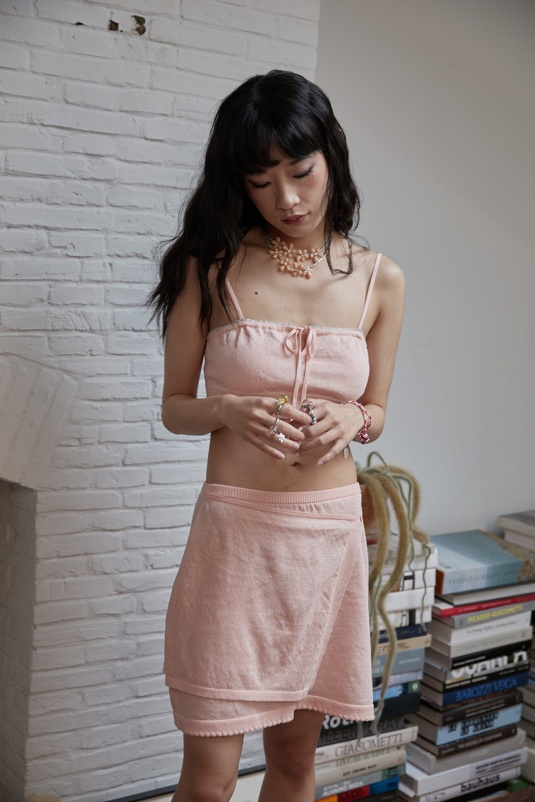 A pink knit mini skirt with a double-layer wrap design and subtle scallop trim along...