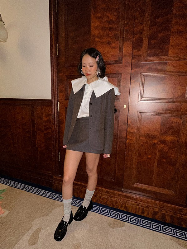 Structured suiting mini with a subtle brown-blue micro-check pattern.Streamlined cut with a touch of retro...