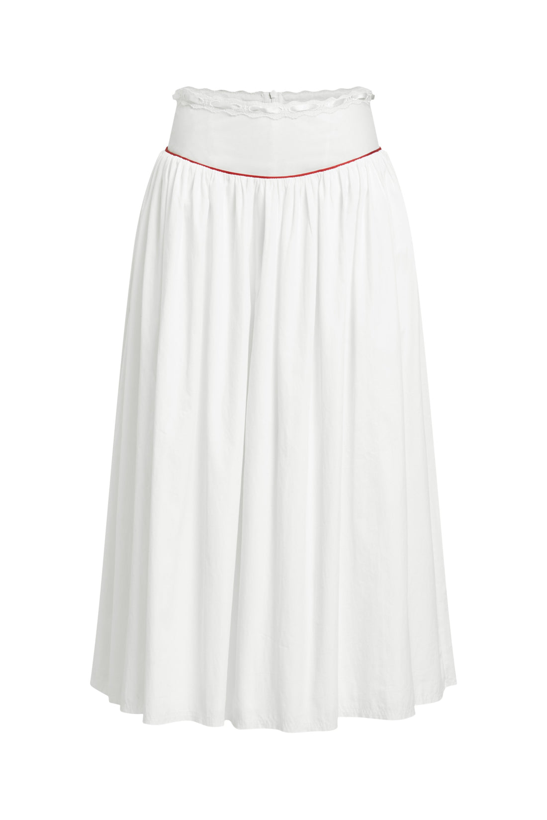 Structured high waist with lace trim and red piping detail.Softly gathered skirt creates a graceful,...