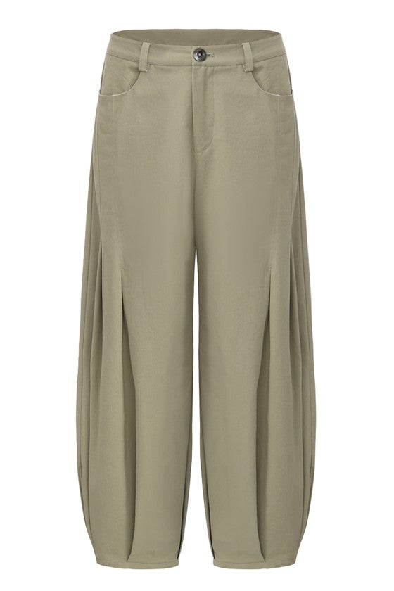 Slim straight silhouette tapers into lantern-shaped cuffs from the knees down.