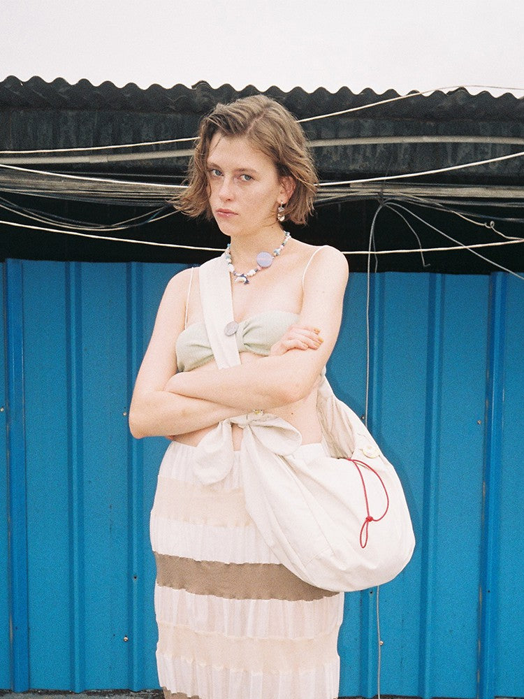 Voluminous pleated body with a signature oversized self-tie ribbon strap, adjustable by knot.