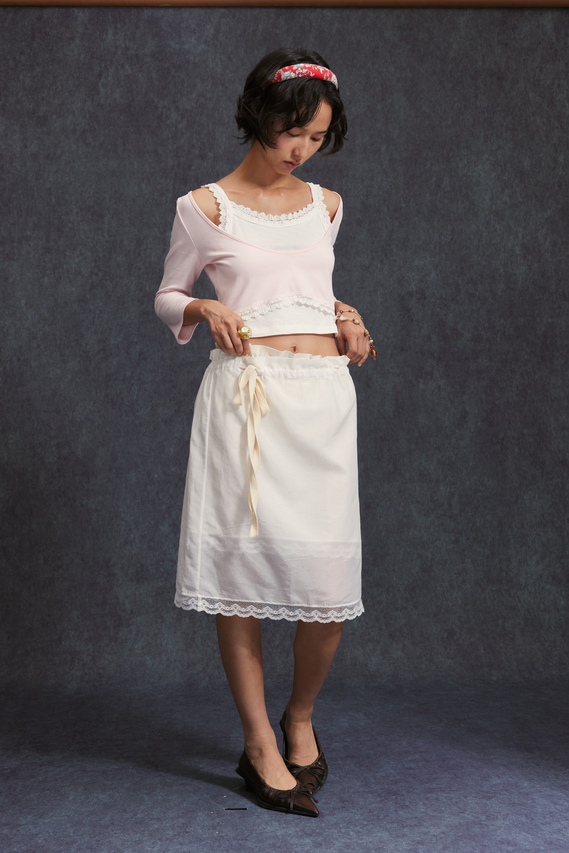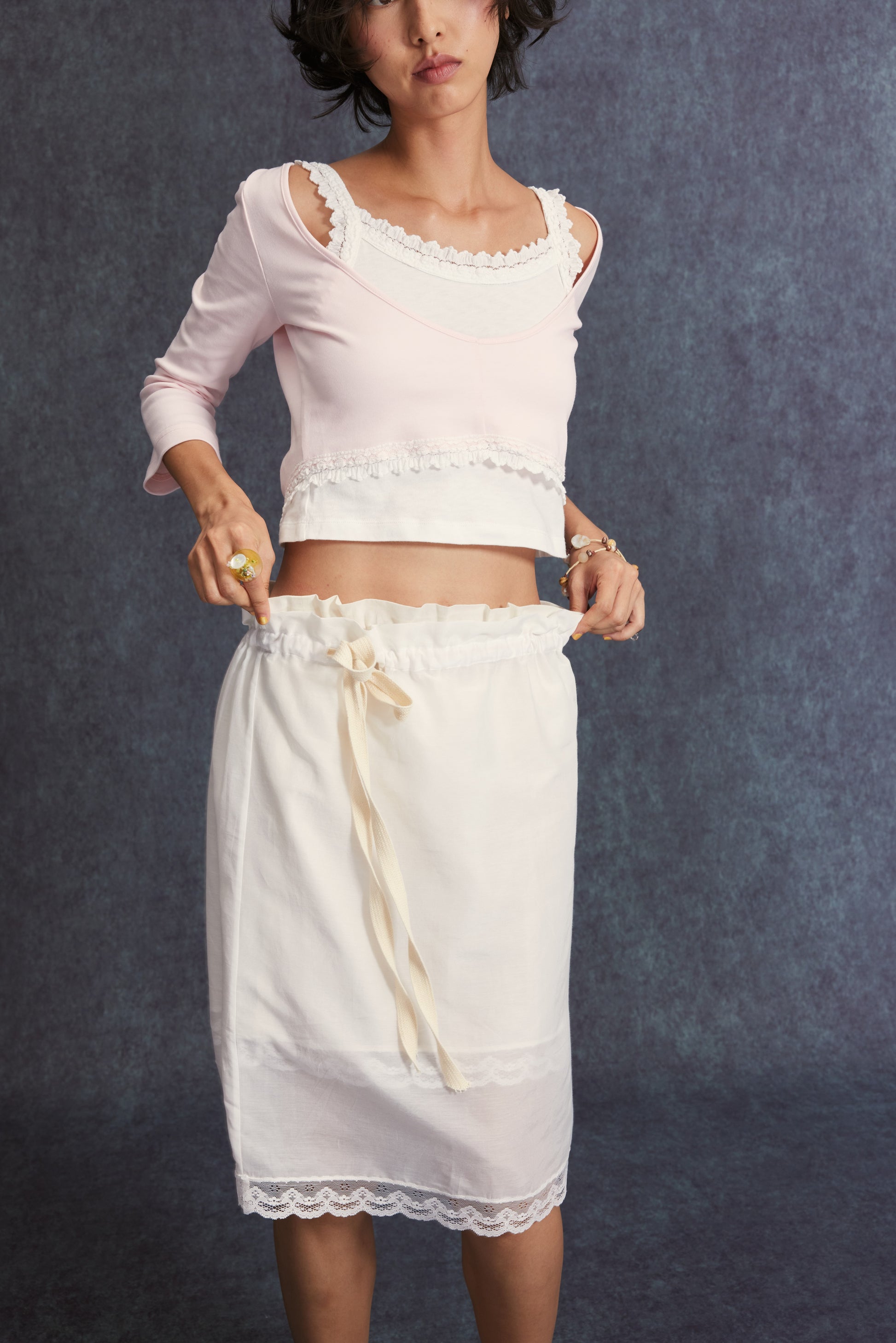 The inner slip skirt has an elastic waist; the outer midi skirt features a drawstring elastic waist.