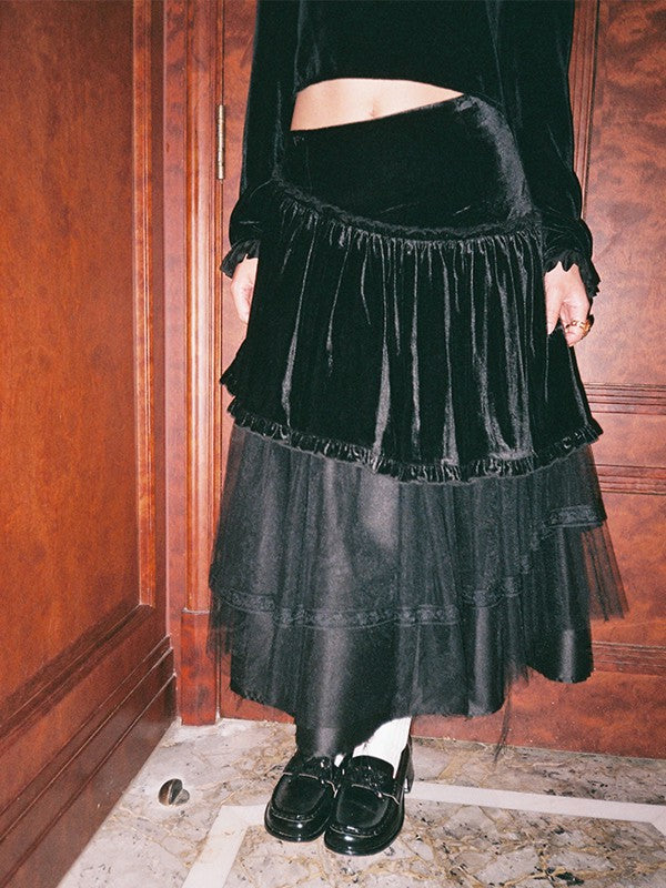 Layered asymmetric skirt with soft chiffon and cotton tiers.