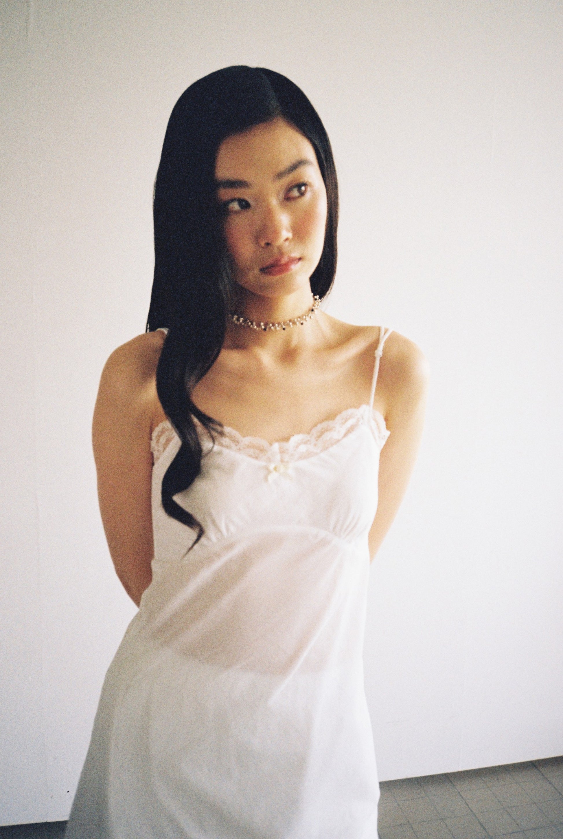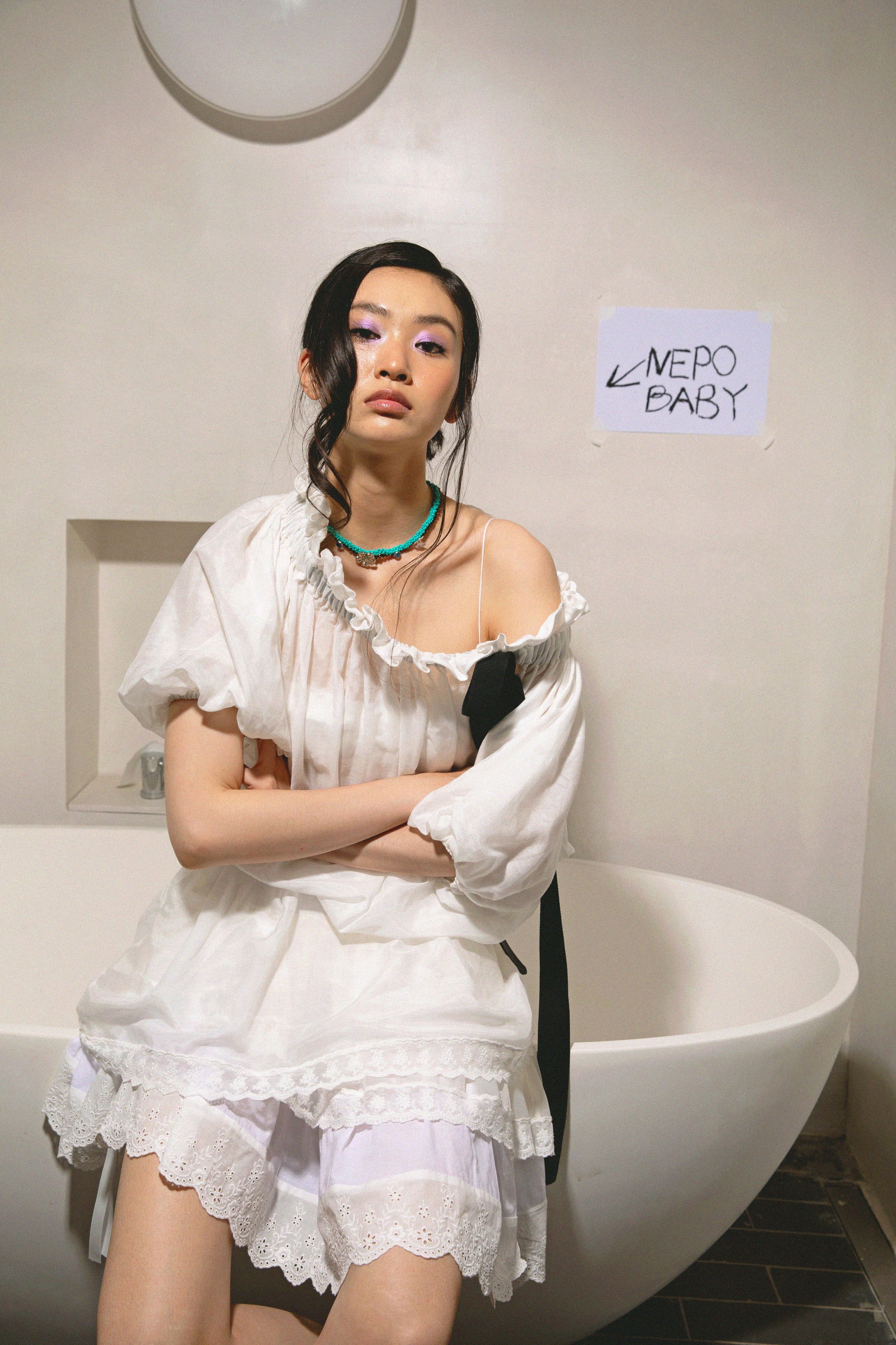 Wide webbing at the neckline to tie a large bow, echoing the layered lace trim of the underskirt when worn together.