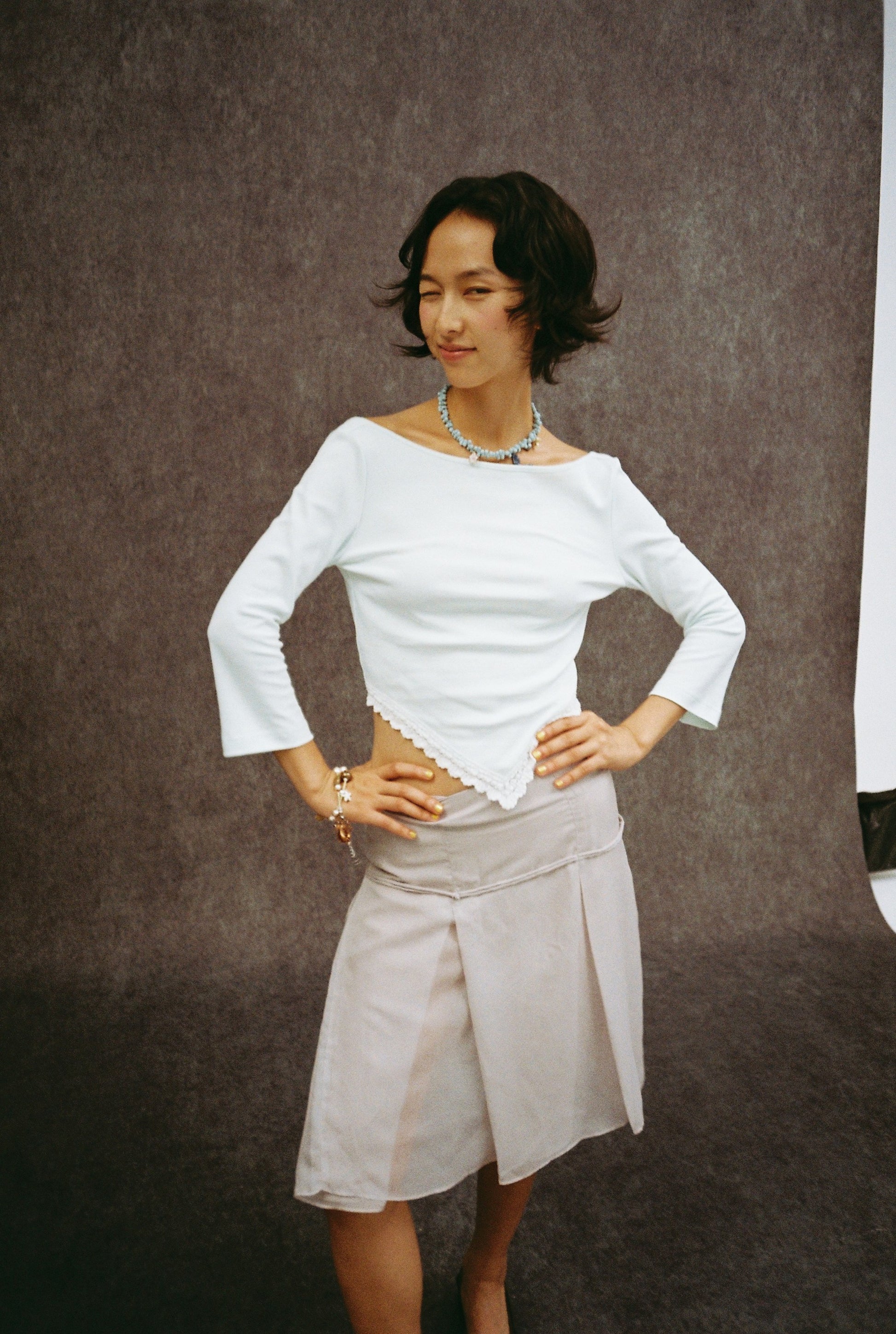 Wide pleats adorned with delicate Chinese-style knot buttons.