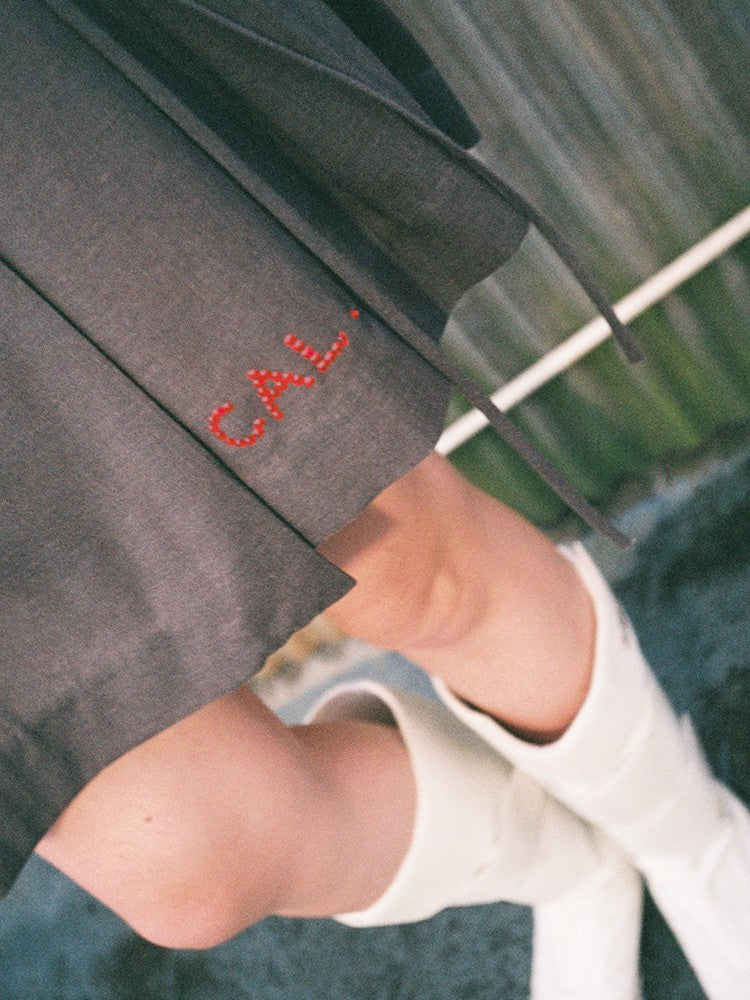 Small tonal embroidery detail near hemline.