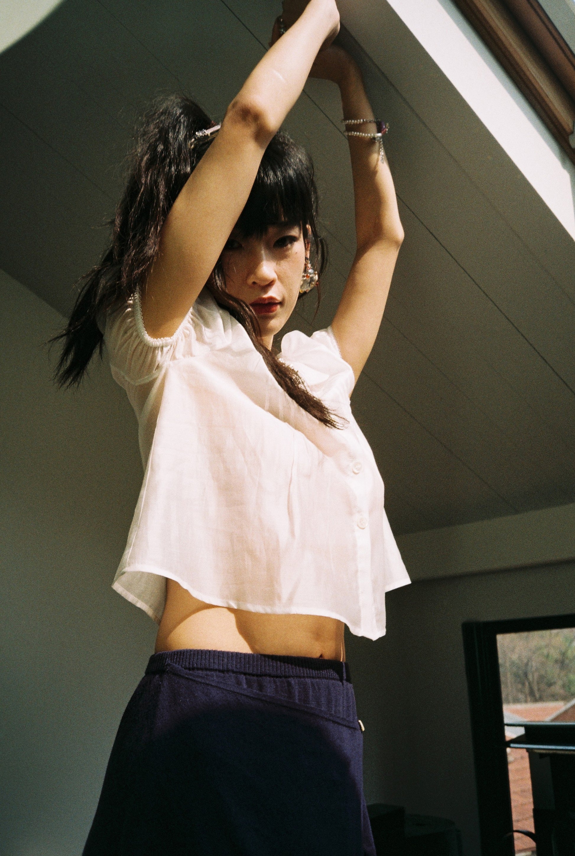 The silhouette is slightly cropped with a gentle A-line flare, balancing sweetness and ease.