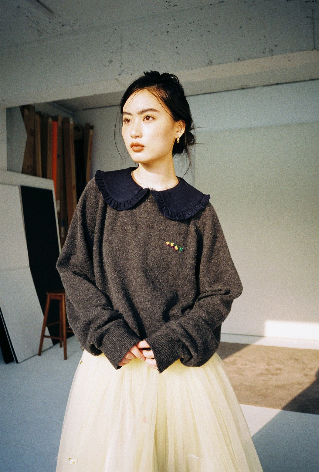 Peter Pan collar adorned with a delicate ruffled trim; slim-fit silhouette.