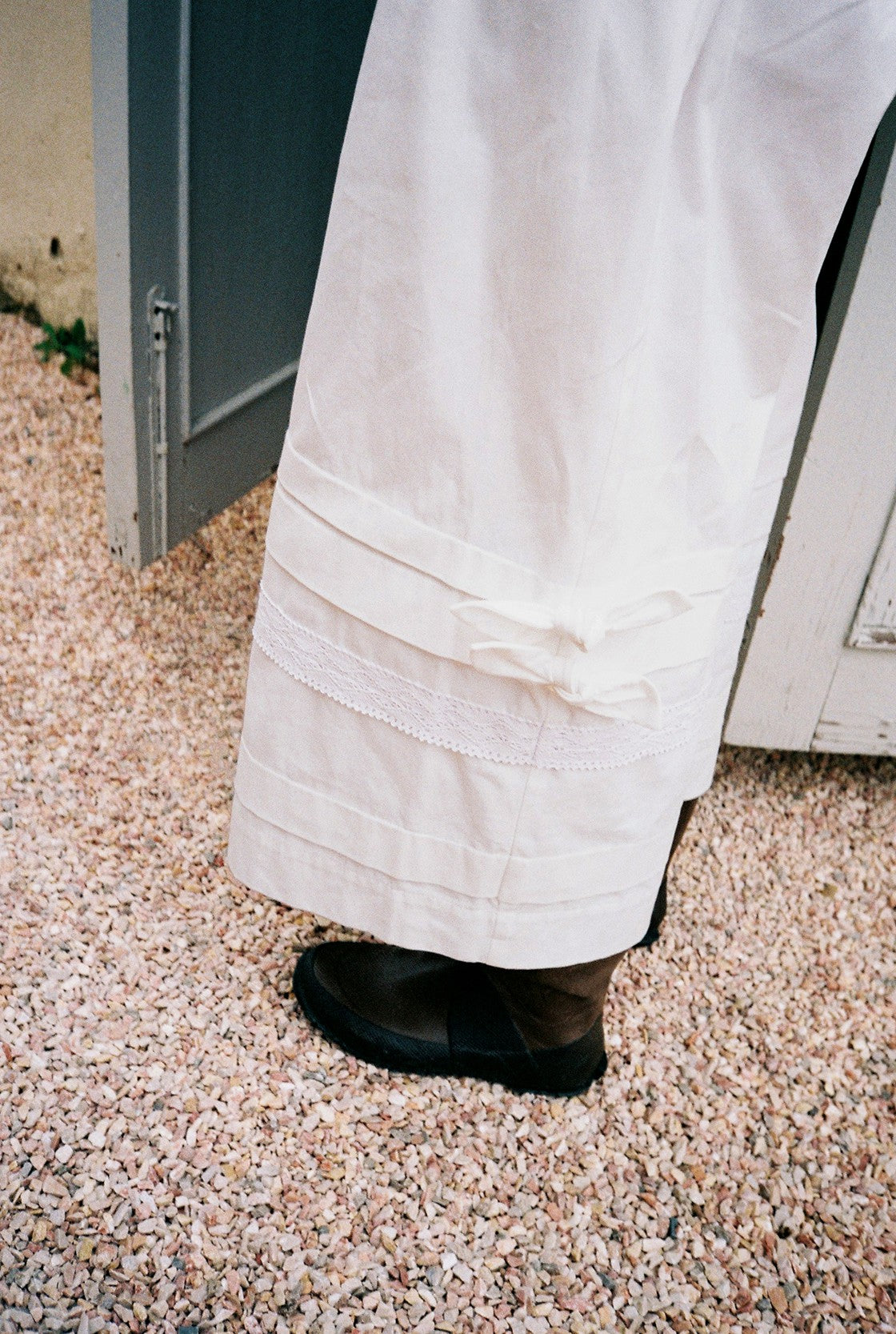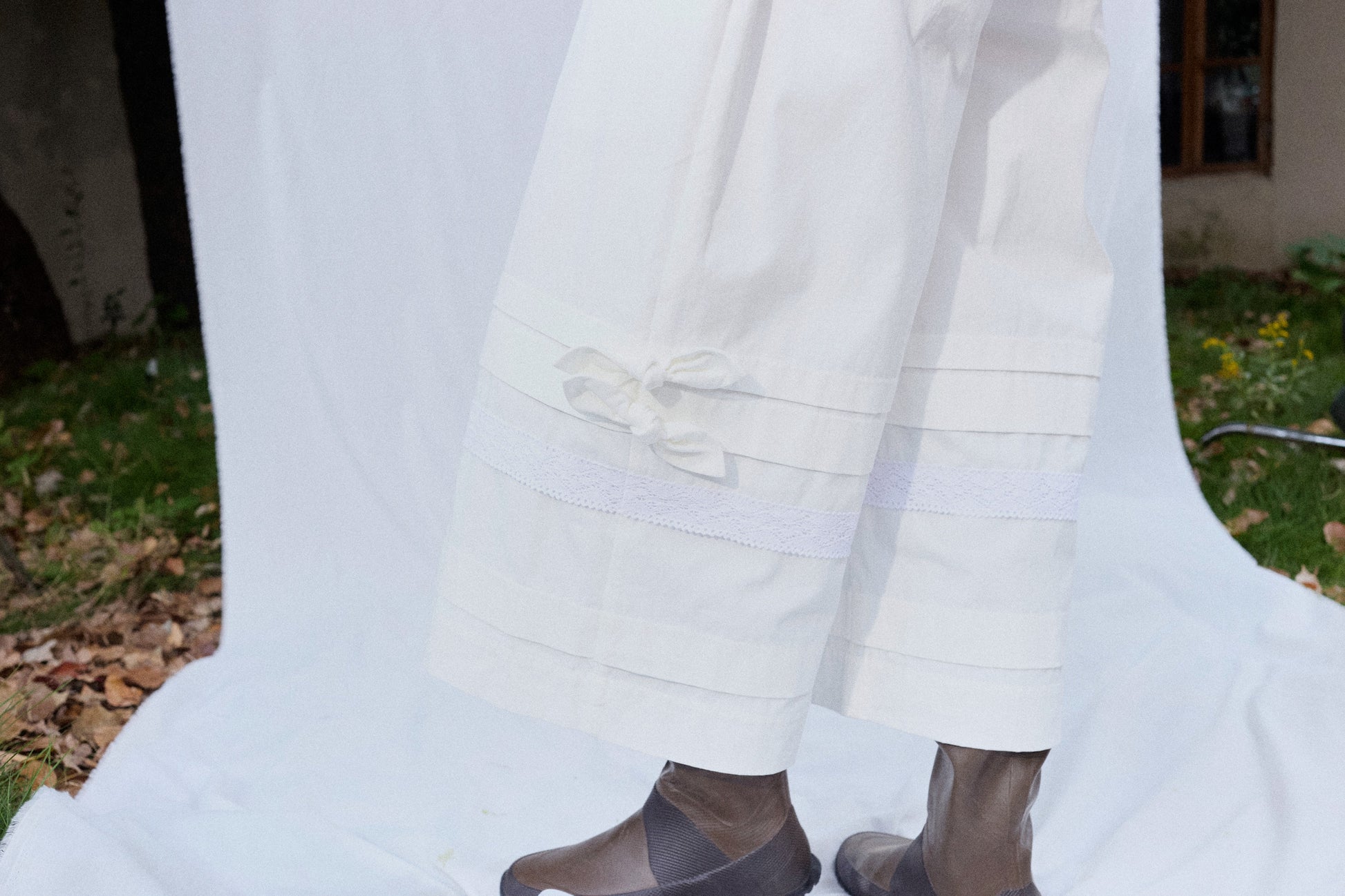 Multi-row pleated seams and lace inserts at the hem.