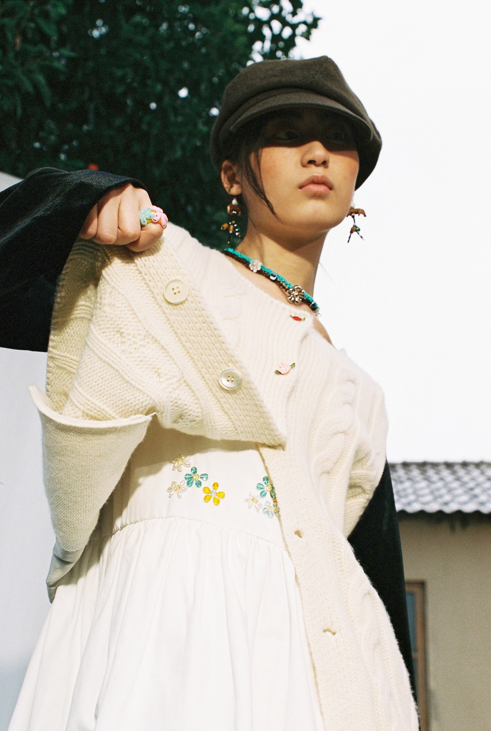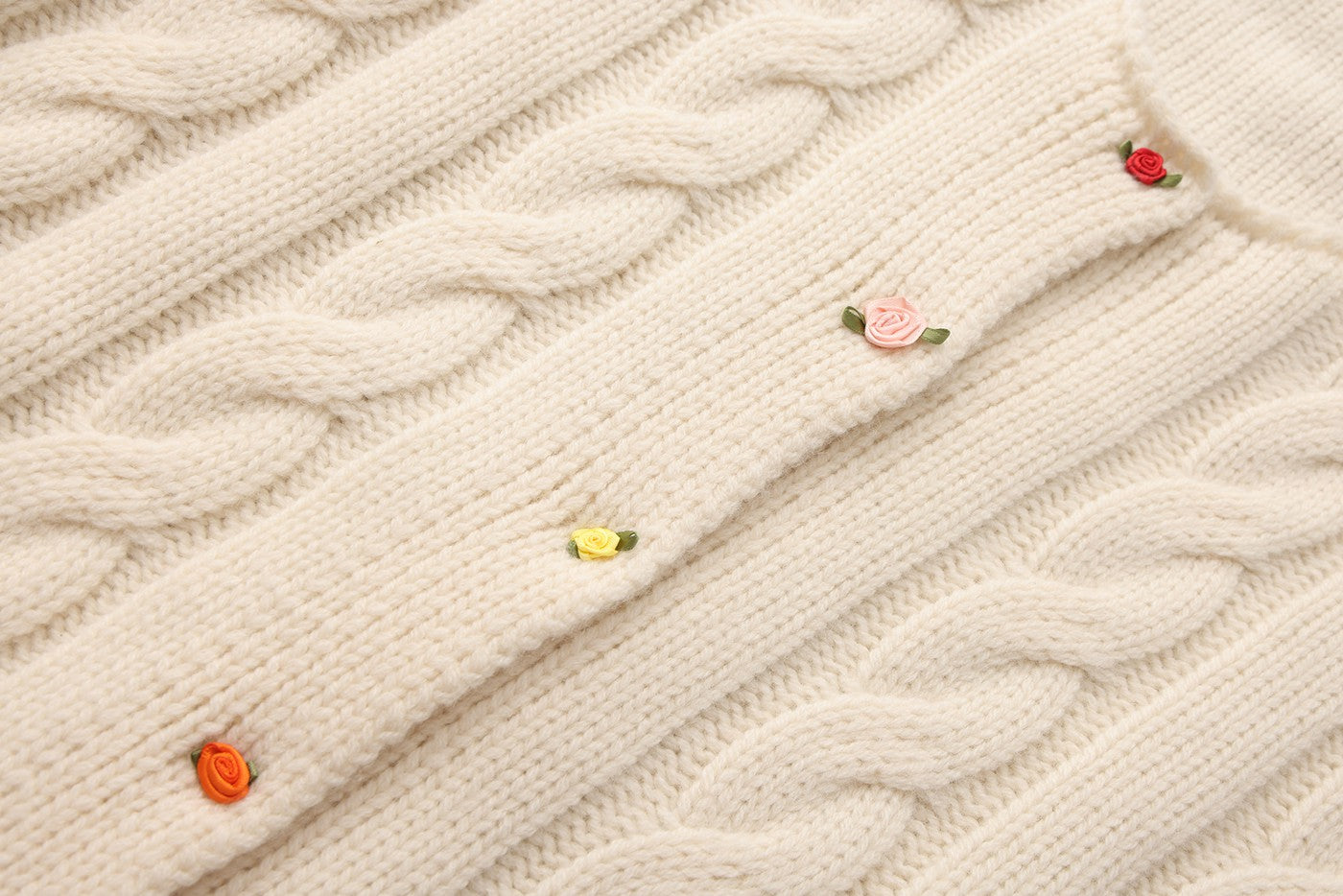 Mini floral buttons add a festive mood and brighten winter looks.