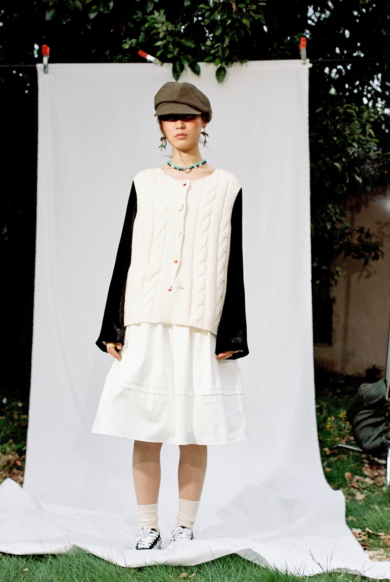 Cream cable-knit body paired with velvet sleeves for a soft winter contrast.