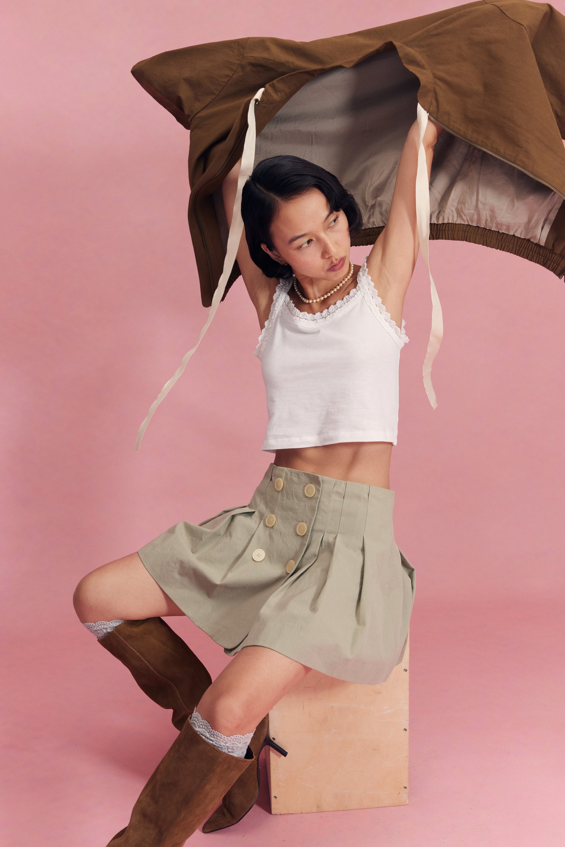 Unzip, tie the bow, and pair with a cashmere sweater and a skirt of the same fabric.
